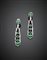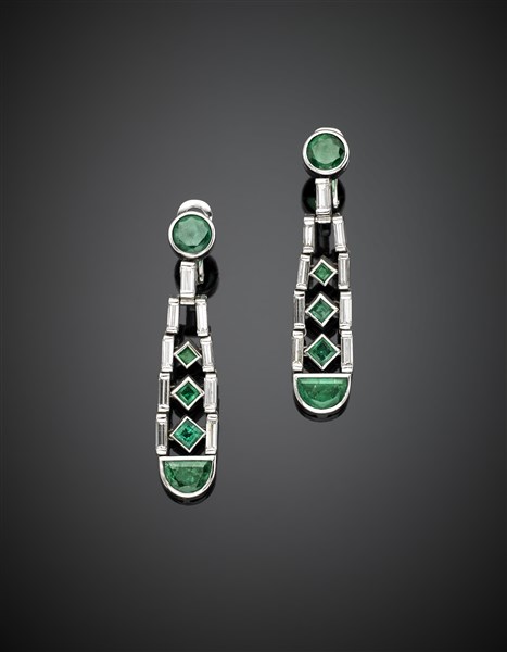 Orecchini pendenti in oro bianco rifiniti con diamanti a baguette per complessivi ct. 1,80 circa e smeraldi per complessivi ct. 4 circa, g 17,90 circa, lungh. cm 4,80 circa.