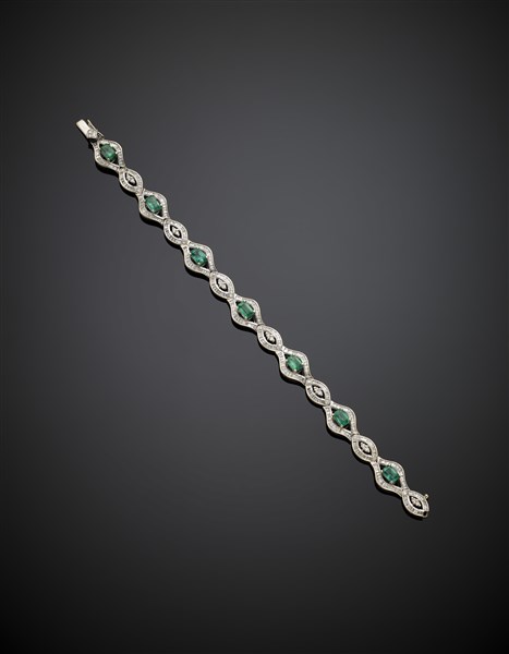 White gold calibré diamond and emerald bracelet, diamonds in all ct. 4 circa g 21 circa, length cm 18.70 circa.