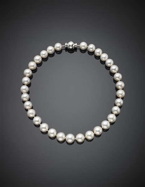 Collana di perle dei Mari del Sud di mm 12/13 circa con chiusura in oro bianco e diamanti, g 93,90 circa, lungh. cm 44,50 circa.