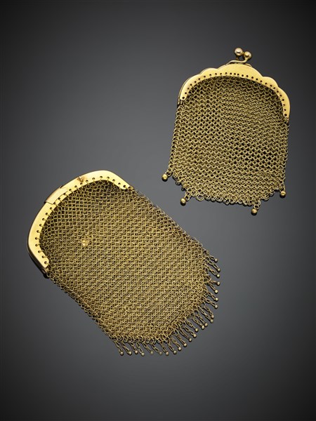 Due borsine portamonete in oro giallo, una lungh. cm 9 circa e l'altra cm 8.20 circa, g 54,70 circa. Una con marchi portoghesi. (difetti e mancanze)