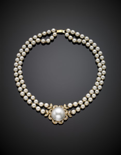 Collana a due fili di perle coltivate con distanziatori e chiusura in oro giallo, rifinita al centro con perla mabé e diamanti a navette per complessivi ct. 3,50 circa g 68,70 circa, lungh. cm 42 circa. Firmato Cusi.
