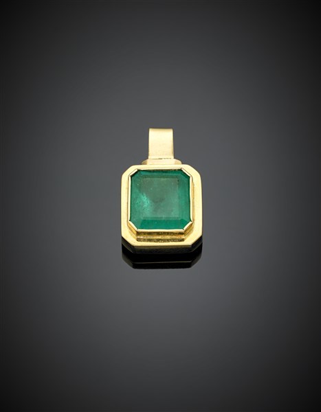 Central ct. 10.80 circa emerald yellow gold pendant, g 12.90 circa, length cm 3.10, width cm 1.80 circa.