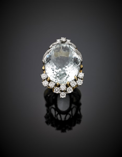 Anello in oro giallo e bianco con acquamarina ovale di mm 24,90 x 19,50 circa rifinito con diamanti per complessivi ct. 1,10 circa, g 27,10 circa misura 19/59.