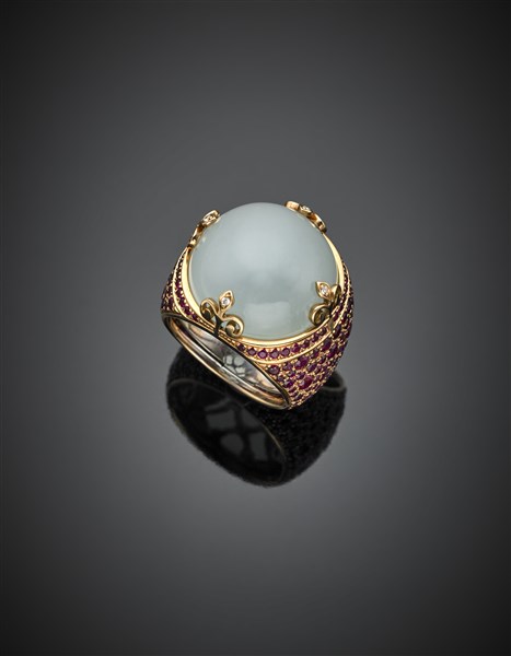 Lotto 955 | DI GREGORIO Anello in oro rosa rifinito con rubini e acquamarina rotonda caboch