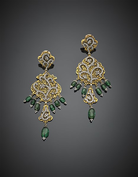 Orecchini pendenti in oro giallo 333/1000 e argento rifiniti con diamanti rotondi e boules di smeraldi, g 26,70 circa, lungh. cm 9,50 circa.