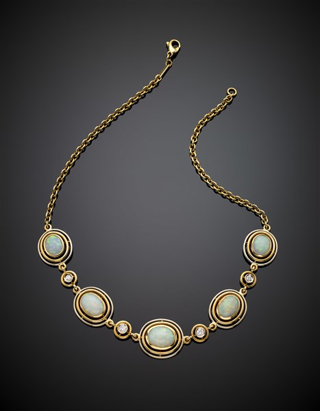 Lotto 959 | *CUSI Girocollo in oro giallo e bianco rifinito con cinque opali nobili ovali e diamanti rotondi
