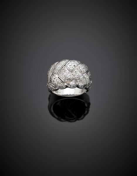 Anello in oro bianco a treccia con pavé di diamanti, g 15,70 circa misura 15/55. Firmato e marcato 3181 AL.
