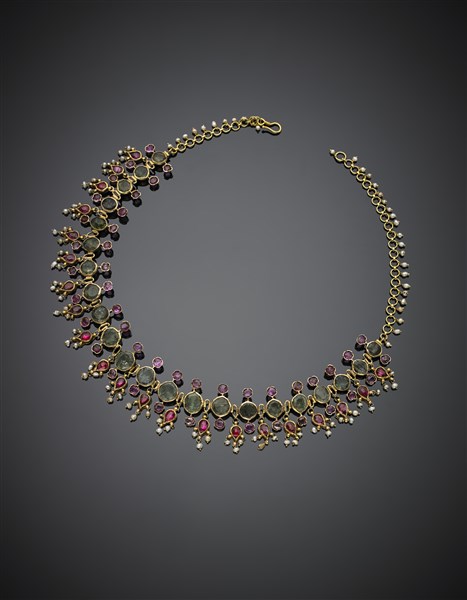 Collier in oro giallo 333/1000 con catenina in oro 750/1000, smeraldi, corindoni rossi e rosa, paste vitree e piccole perle, g 41 circa, lungh. cm 44,30 circa. (difetti)