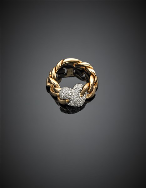 Pink and white gold groumette chain ring with diamond heart shape pavé in all ct. 0.50 circa, g 13.60 circa size 15/55. Marked 3271 AL.