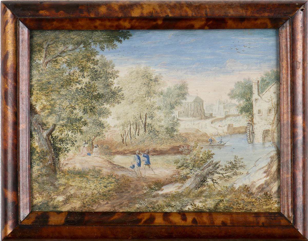 Veduta di fantasia con abside di chiesa e figure - Veduta di fantasia con mulino e figure, Coppia di dipinti