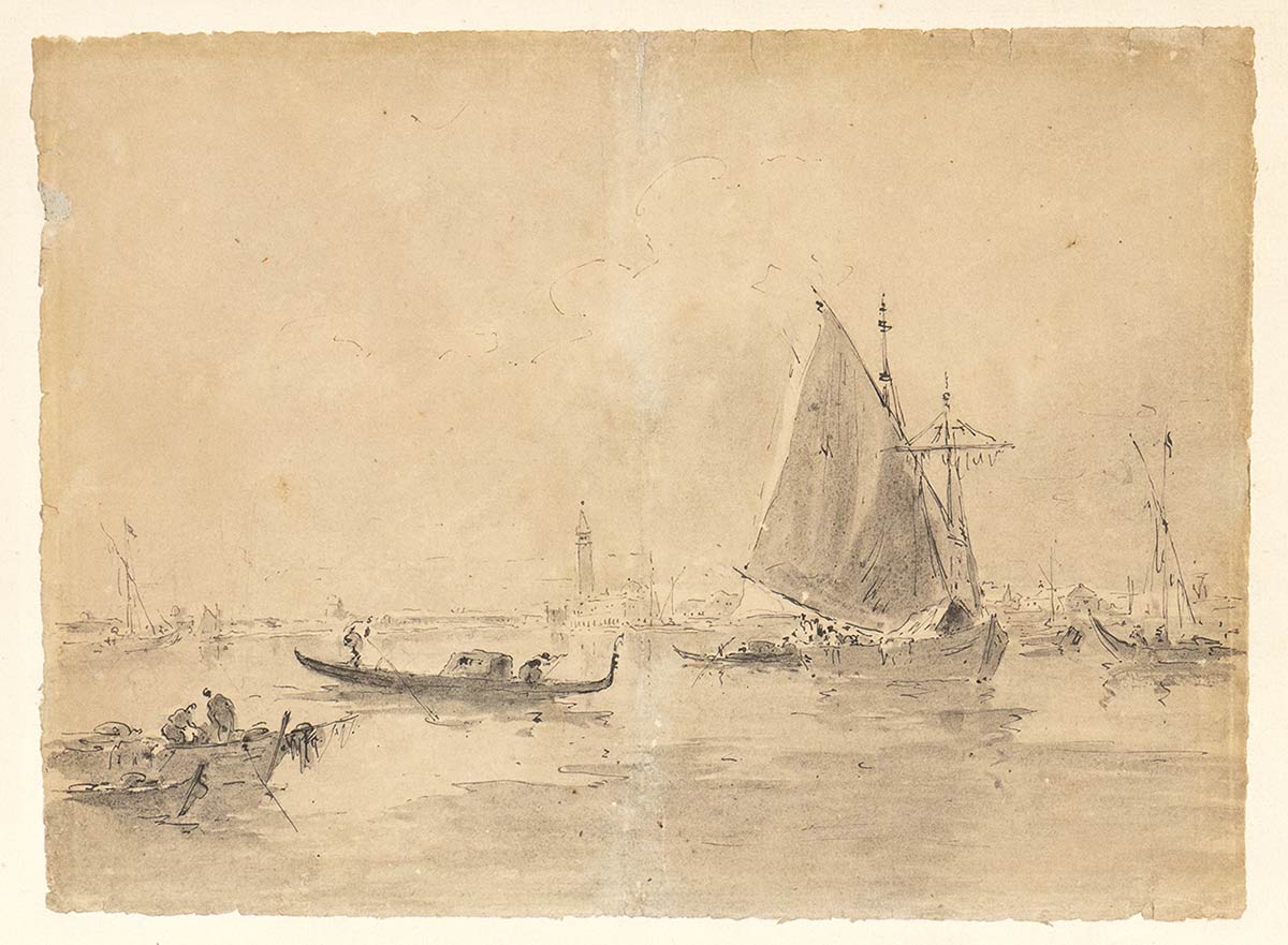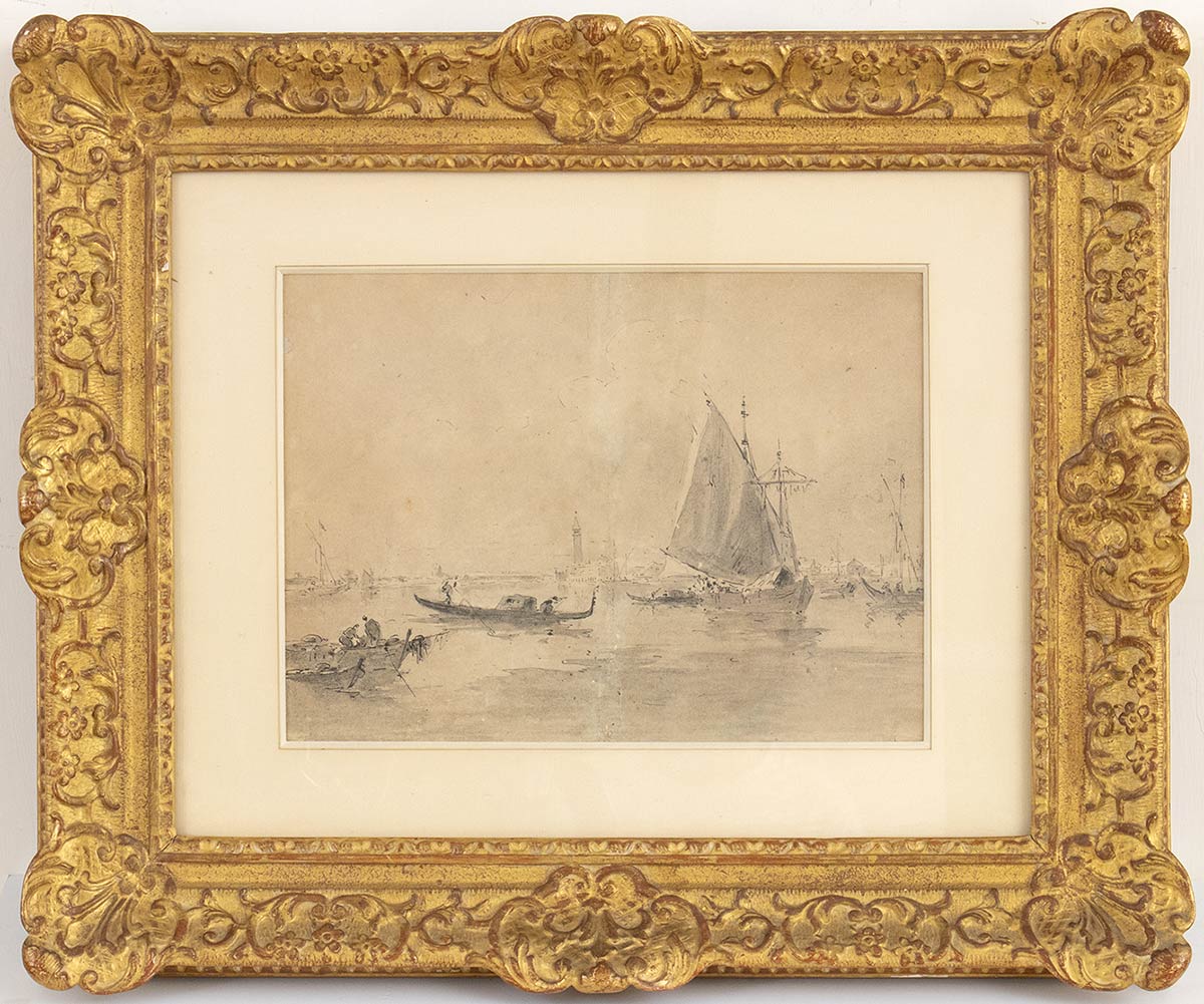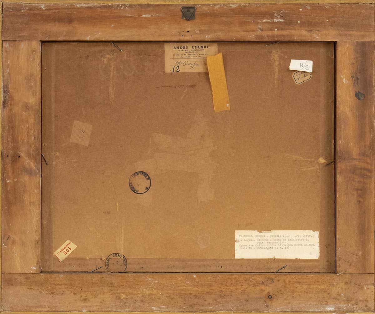 Al retro sul cartoncino vecchi timbri ed etichette. Fra queste si segnalano, in alto a destra "GUARDI / CAT. 50" e in basso a destra cartellino con indicazione di provenienza dalla vendita dell'11/3/1964 Hotel Drouot - Sala 10 - Catalogato al n. 12".