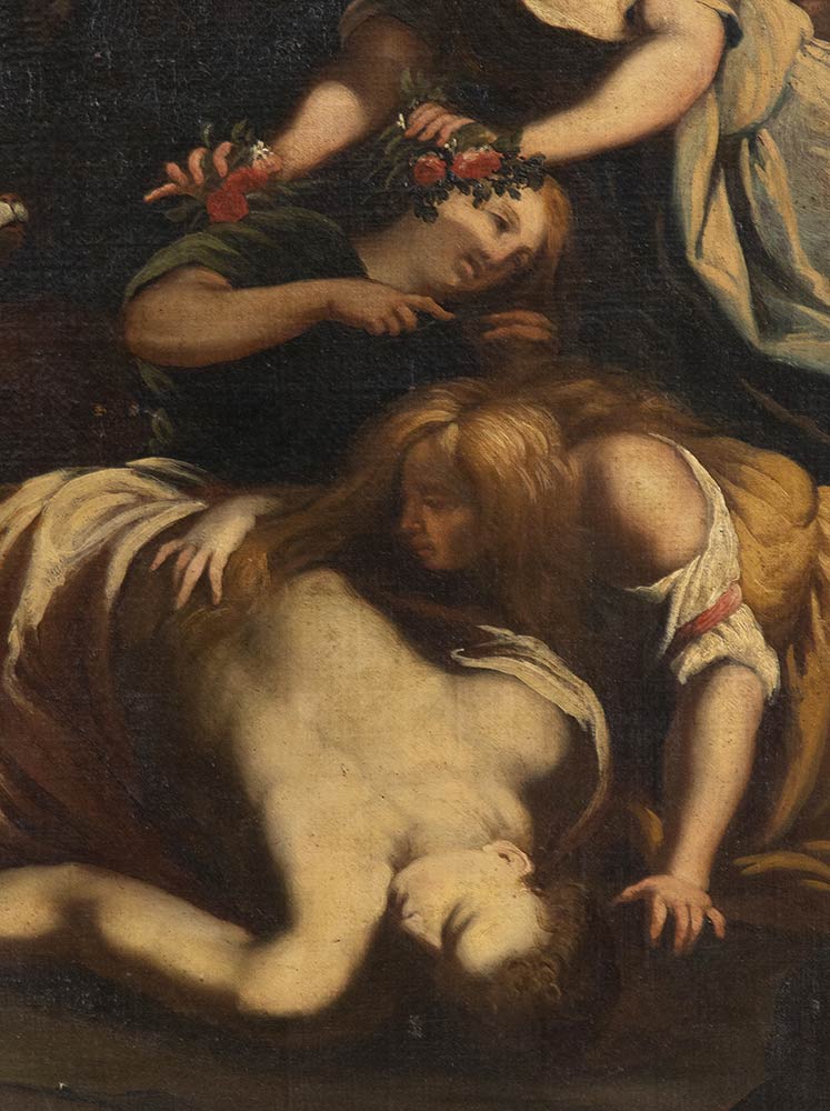 Strappo della tela in alto a destra sopra la spalla di un'ancella.
