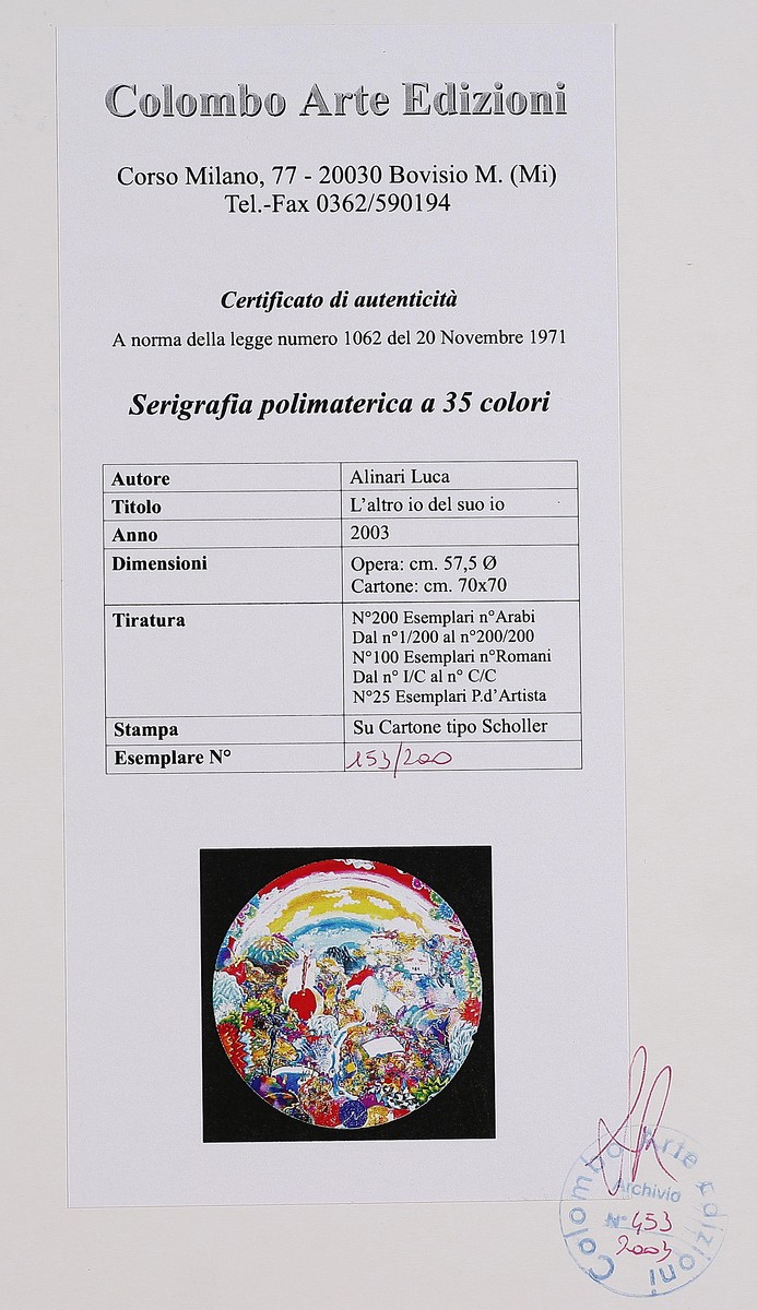 ALINARI LUCA (n. 1943) L'altro Io del suo Io, 2003. Serigrafia su cartone. Diametro: 57,5 cm. Misure di tutto il cartone: 70x70 cm. Tir. 153/200 in basso a sinistra. Firma in basso a destra. Al retro cartiglio descrittivo dell'opera di -Colombo Arte Edizioni- (Bovisio M., Milano), e timbro -Colombo Arte Edizioni- con numero d'archivio.