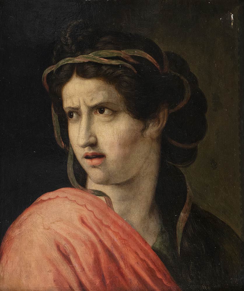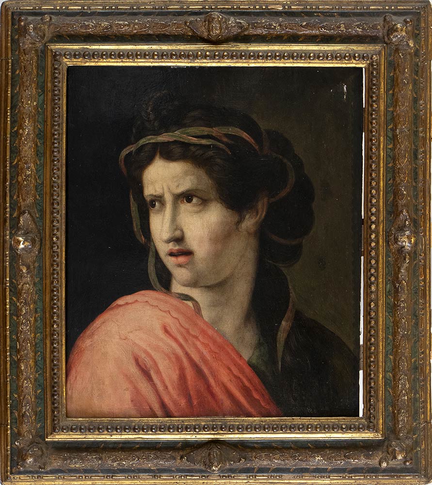In questa plastica effige di Sibilla si riconosce senza esitazioni un notevole frutto del primo manierismo tosco-romano, il cui principale testo sacro è naturalmente rappresentato dalla volta sistina di Michelangelo. L’immagine può essere letta come una specie di emblema felicemente riassuntivo di tutta la più aggiornata cultura figurativa centro-italiana all’altezza del quarto - quinto decennio del Cinquecento. Stilisticamente, infatti, oltre al modello delle Sibille sistine e della Cleopatra eseguita da Michelangelo per Tommaso Cavalieri, si percepisce qui un colto background che include Andrea del Sarto, Pontormo, Francesco Salviati e Sebastiano del Piombo. Tale commistione di elementi, veramente paradigmatica di questa straordinaria congiuntura dell’arte italiana, ha spinto in passato Elizabeth Pilliod a indirizzare decisamente l’attribuzione del dipinto qui in oggetto verso il giovane Jacopino del Conte, allievo a Firenze di Andrea del Sarto, segnalando sia le affinità della nostra tavola con opere del maestro (in particolare le Madonne della Pala di Gambassi e della Pala di Poppi della Galleria Palatina di Firenze), sia le notevoli analogie con dipinti fiorentini dello stesso Jacopino, quali la Madonna col Bambino e San Giovanni Battista della Gemäldegalerie di Berlino e la Madonna della Carità del Museo dell‘Ospedale degli Innocenti di Firenze.