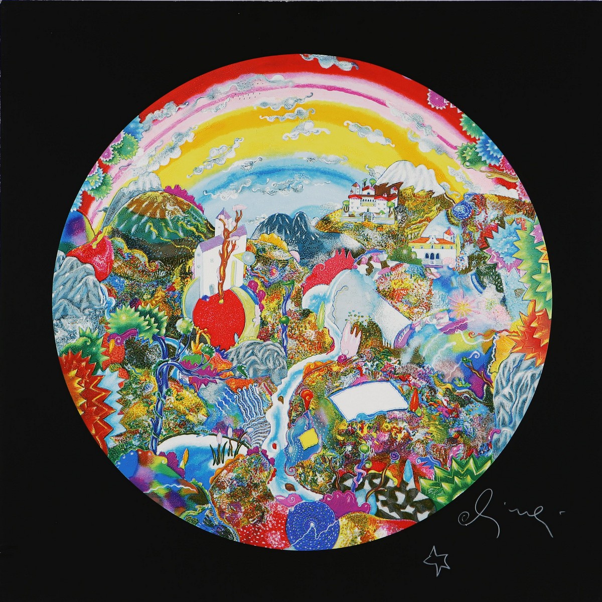 ALINARI LUCA (n. 1943) Senza titolo. Serigrafia su cartone. Diametro: 57,5 cm. Misure di tutto il cartone: 70x70 cm. Firma in basso a destra.