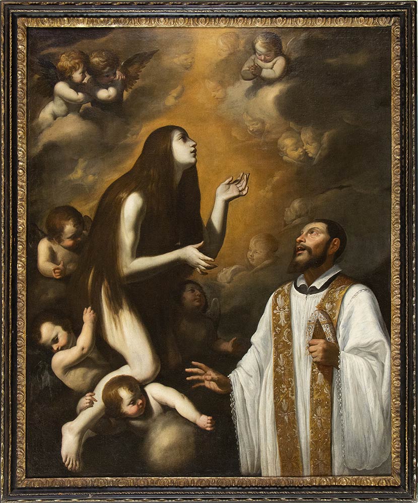 Questa bella tela d'altare costituisce una seconda versione del dipinto del medesimo soggetto eseguito per la chiesa del Monastero di Santa Maria della Sapienza a Napoli e oggi ricoverato presso il locale Arcivescovado. Con quest'ultima opera, la nostra tela condivide le medesime problematiche attributive, come pure una certa ambiguità iconografica, che ha generato la confusione tra S.Maria Egiziaca in estasi con San Zosima e La visione della Maddalena in estasi sorretta dagli angeli da parte di S. Gaetano da Thiene, verso la quale ormai si dovrebbe definitivamente corvergere. Più complesso il nodo relativo all'autore, o agli autori, delle due versioni, a proposito del quale occorre partire dall'esemplare oggi all'Arcivescovado, sovente considerato una delle prove d'esordio di Andrea Vaccaro. Sulla tela si può leggere in basso a sinistra un'iscrizione che recita "GIOS.E DE GUIDA". Pur essendo spuria l'iscrizione costituisce un indizio serio per il riconoscimento della paternità dell'opera, in accordo, peraltro, con l'indicazione delle fonti ottocentesche. Accogliendo per essa il riferimento a Giuseppe di Guido (alias Maestro di Fontanarosa), come ormai parrebbe opportuno, la tela della Sapienza verrebbe a fissare il punto di massima tangenza stilistica di questo maestro con il giovane Andrea Vaccaro, col quale egli fu in effetti in stretti rapporti, se nel 1628 fece da padrino al battesimo della figlia di Andrea, Angela Geronima Vaccaro. Non si può fare a meno di rilevare, peraltro, come entrambe le versioni, e specialmente la nostra, appaiano di più agevole e coerente inserimento nel catalogo giovanile del Vaccaro che non in quello del Maestro di Fonatanarosa, come suggeriscono le affinità con opere come Giuditta e Oloferne in collezione Koelliker, il Martirio di Sant'Agata della Galerie G. Sarti di Prigi o il Martirio di San Sebastiano della Galerie Canesso di Parigi, tutti autografi certi del Vaccaro che non dovrebbero superare, come l'opera qui in oggetto,la soglia del 1640.