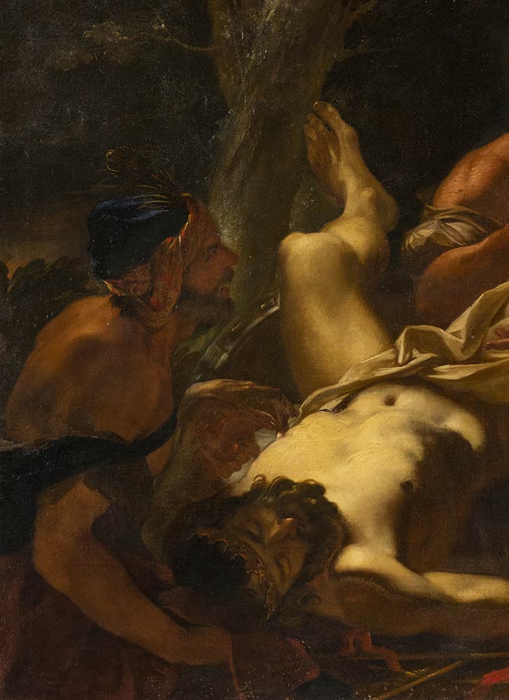 Quest'immagine potente raffigura il corpo di Dario, re dei persiani, che secondo la narrazione di Plutarco viene rinvenuto da Alessandro Magno, suo acerrimo nemico, riverso in fin di vita su un carro dopo essere stato ucciso dalle sue stesse milizie. Il dipinto si impone per l'arditezza della composizione, con la scorciatura esasperata del corpo di Dario, per l'elaborato impianto luministico e per la finezza drammaturgica dell'impianto narrativo, col gesto pietoso di Alessandro che sembra accoglierere il ringraziamento del nemico per la benevolenza mostrata verso i suoi congiunti. Non meno notevole risulta la densità di riferimenti pittorici che si trovano originalmente condensati nel dipinto. In esso si distingue un incrocio di elementi veneti (da Tintoretto ai tenebrosi Loth, Zanchi e Langetti, ma anche Sebastiano Ricci), lombardi (Paolo Pagani) e romani (Cortona, Baciccio).