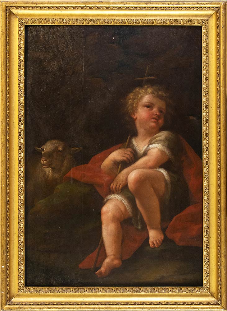 Questo bella effige del giovane San Giovanni Battista, accompagnato dai suoi attributi canonici del crocifisso e dell'agnello, fu riconosciuto come opera sicura di Paolo de Matteis da Riccardo Lattuada e Giuseppe Napoletano. Esso costituisce una rarissima prova realizzata dal pittore su tavola. L'opera, di particolare eleganza e compostezza formale, presenta un'evidente vicinanza ai modi maturi di Luca Giordano ed è collocabile nell'ultimo decennio del Seicento.