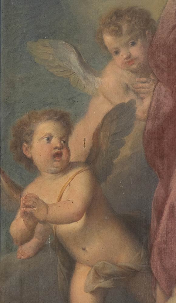 Gregorio Lazzarini è stato un protagonista indiscusso della scena artistica veneziana a cavallo tra Sei e Settecento. La sua considerazione odierna è però ben lontana da quella che lo accompagnò in vita, anche per la mancanza di un affidabile studio monografico moderno, ed egli si trova oggi più spesso citato come maestro di Giambattista Tiepolo che per i propri notevolissimi meriti di pittore. In questa circostanza si propongono due tele inedite senz'altro da riferire all'artista e che testimoniano eloquentemente le sue inconfondibili qualità. Rifulge qui l'elegante e limpido classicismo che caratterizza in particolare la maniera matura del Lazzarini, a partire dall'ultimo decennio del Seicento. La chiarezza strutturale e il pieno dominio del disegno conferiscono massimo risalto alla figura plastica e grandiosa del Cristo che, assiso sulla nuvola, conquista tutto il primo piano della scena. Si ammirano qui la grazia equilibrata della composizione, le gamme cromatiche fredde e delicate e l'accurata levigatezza della pennellata. L'alto magistero accademico rende chiara, da un lato, la matrice veneta e la vicinanza con l'amico Antonio Bellucci, ma ancor più, dall'altro, l'estrema attenzione di Lazzarini nei confronti della pittura bolognese di secondo Seicento (in particolare Cignani e Franceschini). Come termini di confronto per la nostra tela, in origine probabilmente destinata, come il suo pendant lotto 134, all'altare di una cappella privata, possiamo citare lo Sposalizio mistico di santa Caterina da Siena (Treviso, Museo Civico) e l'Allegoria del Merito (Venezia, Palazzo Ducale, e Polesello, Villa Morosini).