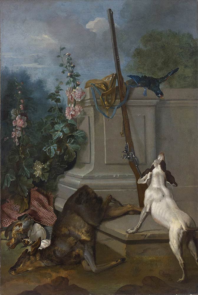 In particolare il dipinto può essere accostato a Jean-Baptiste Oudry, che fu mirabile animalista e dal 1724 divenne pittore di corte reale, specializzato proprio nella raffigurazione di temi legati alla caccia. Interessanti paragoni possono essere istituiti fra la nostra tele e opere di Oudry come il Cane che fa la guardia alla cacciagione del Metropolitan Museum di New York, Due cani da caccia con volatili e salvaggina passato in asta da Sotheby’s Paris il 26 giugno 2014 (l. 40) il Trofeo di caccia del Nationalmuseum di Stoccolma: opere nelle quali si ritrovano molti degli elementi principali dell’opera qui in oggetto, dal fucile sul plinto all’architettura di marmo su cui è poggiato (forse una fontana), dal cane alla cacciagione, sino alle presenze floreali e al luminoso paesaggio.