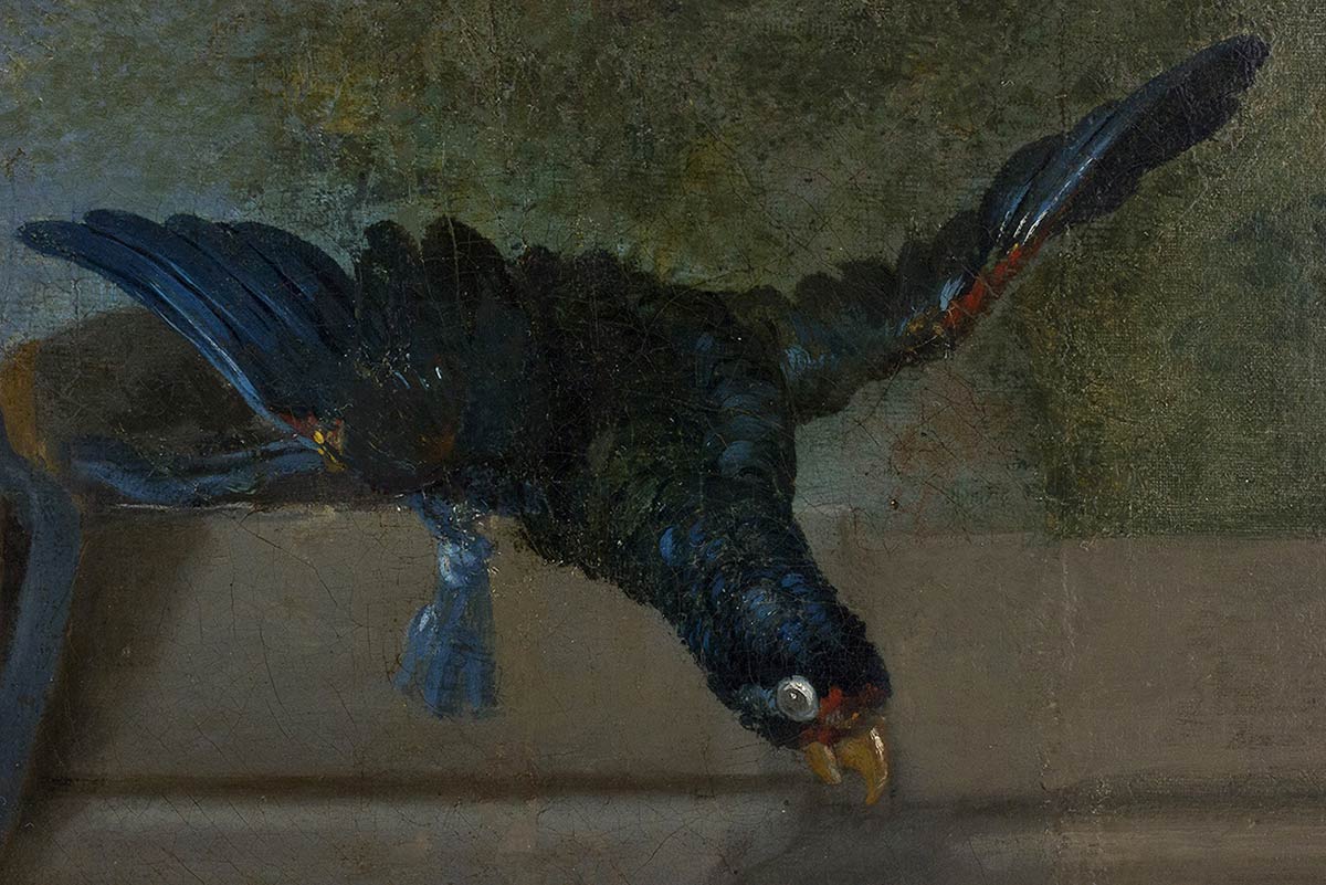 La tipologia della natura morta con scene di caccia, o trofei di caccia, si affermò nei Paesi Bassi nel corso del XVII secolo con artisti come Frans Snyders, Jan Fyt e Willem Van Aelst e trovò nel Settecento il suo più alto sviluppo in area francese, dove fu particolarmente richiesta e promossa dalla committenza reale. I suoi esponenti principali furono senza dubbio dapprima Alexandre-Francçois Desportes e Jean Baptiste Oudry, e poi Jean-Baptiste Simeon Chardin. E’ certamente in questo contesto che va collocato il nostro raffinato dipinto, che esemplifica al meglio le virtù pittoriche richieste dal genere: equilibrio compositivo, abilità nella rappresentazione degli animali vivi (il superbo cane che punta l’uccello adagiato sul piedistallo) e morti (volatili e selvaggina), efficace organizzazione della componente simbolica (legata al contenuto di vanitas) ed eleganza coloristica, con una paletta che insiste sui toni chiari, prediletti da tutti e tre i grandi maestri francesi succitati.