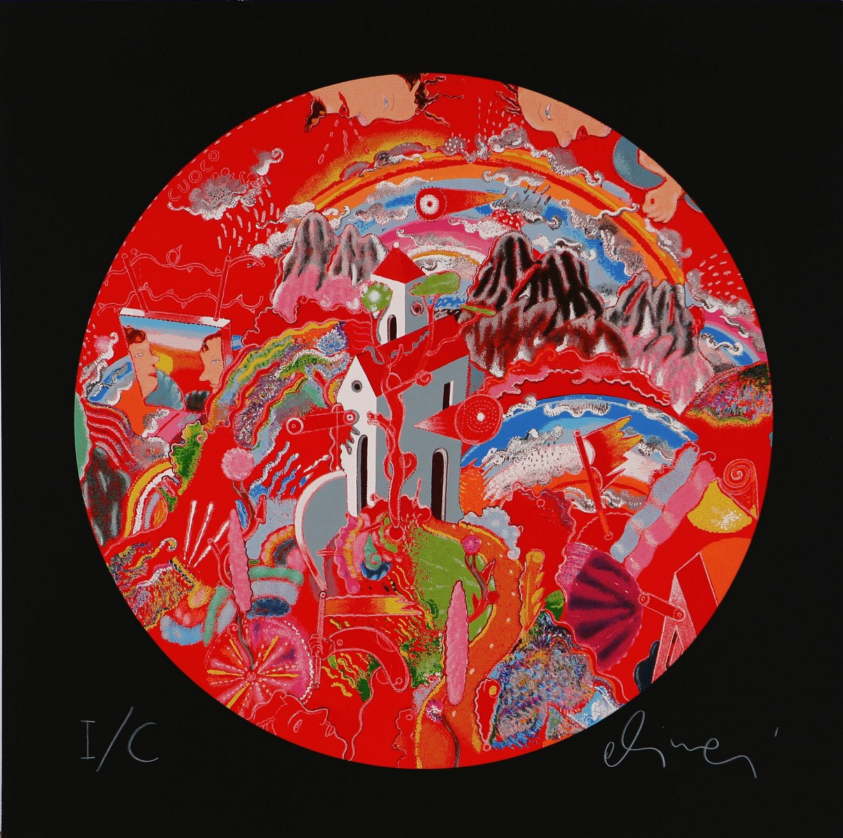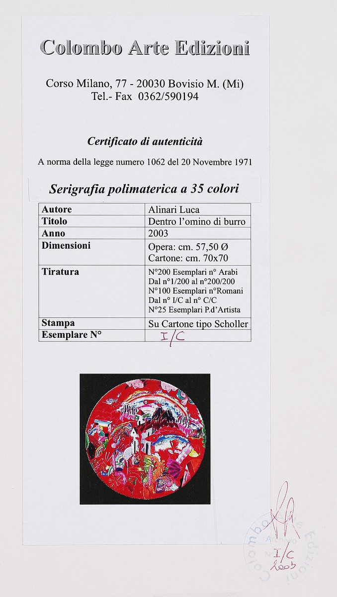 ALINARI LUCA (n. 1943) Dentro l'omino di burro, 2003. Serigrafia su cartone. Diametro: 57,5 cm. Misure di tutto il cartone: 70x70 cm. Tir. I/C in basso a sinistra. Firma in basso a destra. Al retro cartiglio descrittivo dell'opera di -Colombo Arte Edizioni- (Bovisio M., Milano), e timbro -Colombo Arte Edizioni- con numero d'archivio.