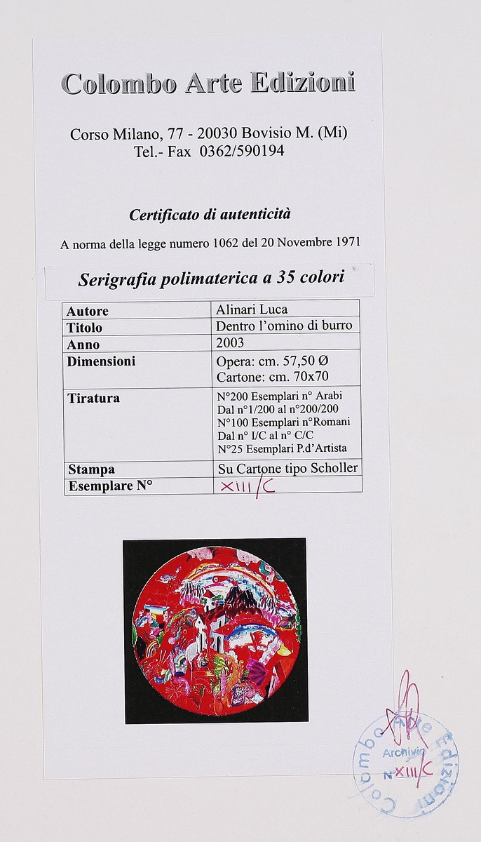 ALINARI LUCA (n. 1943) Dentro l'omino di burro, 2003. Serigrafia su cartone. Diametro: 57,5 cm. Misure di tutto il cartone: 70x70 cm. Tir. XIII/C in basso a sinistra. Firma in basso a destra. Al retro cartiglio descrittivo dell'opera di -Colombo Arte Edizioni- (Bovisio M., Milano), e timbro -Colombo Arte Edizioni- con numero d'archivio.