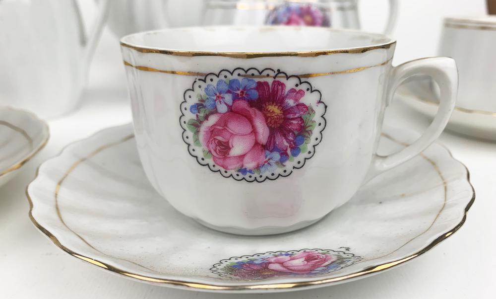 composto da teiera, lattiera, zuccheriera e 4 tazze con piattino. Piccoli difetti