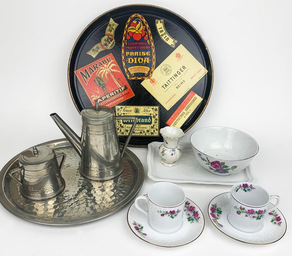 vassoio pubblicitario anni '60 diam cm 30, un vassoio in peltro con caffettiera e zuccheriera 'solitaire' della prima met? del XX secolo, 2 tazzine in porcellana con piattino e vassoietto e un vaso 'soliflore'