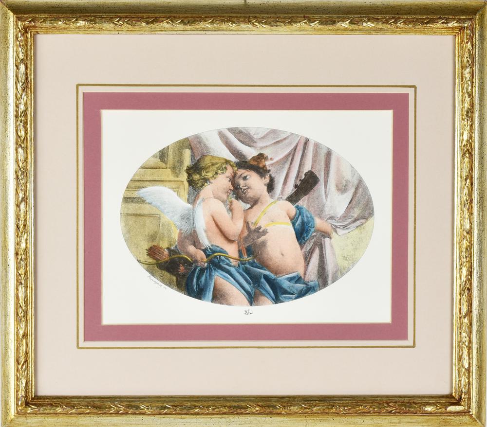 STAMPA A COLORI SU CARTA raffigurante coppia di putti alati festanti, da...
