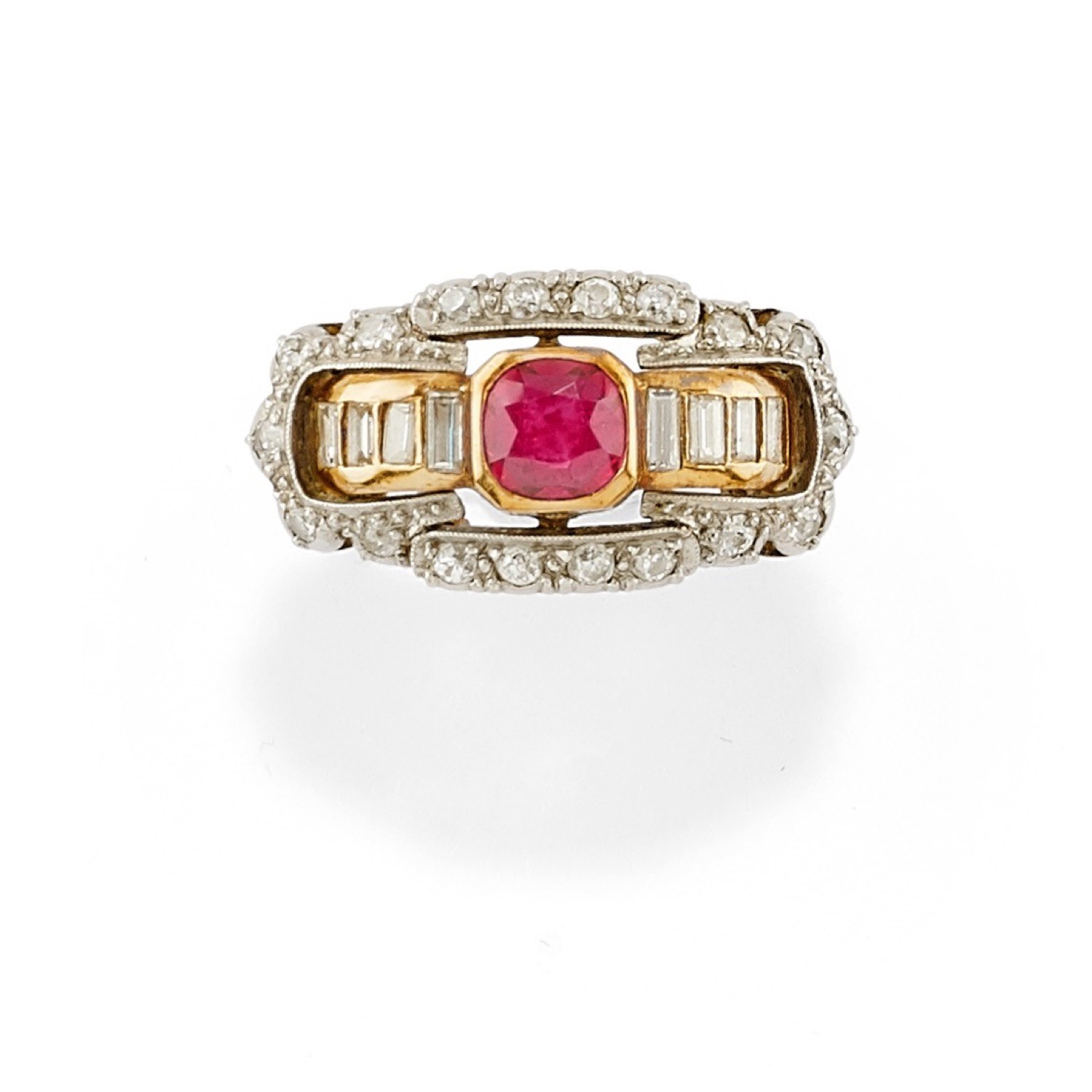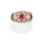 oro giallo 18K, rubino taglio cuscino ct 1,00 ca e diamanti.