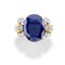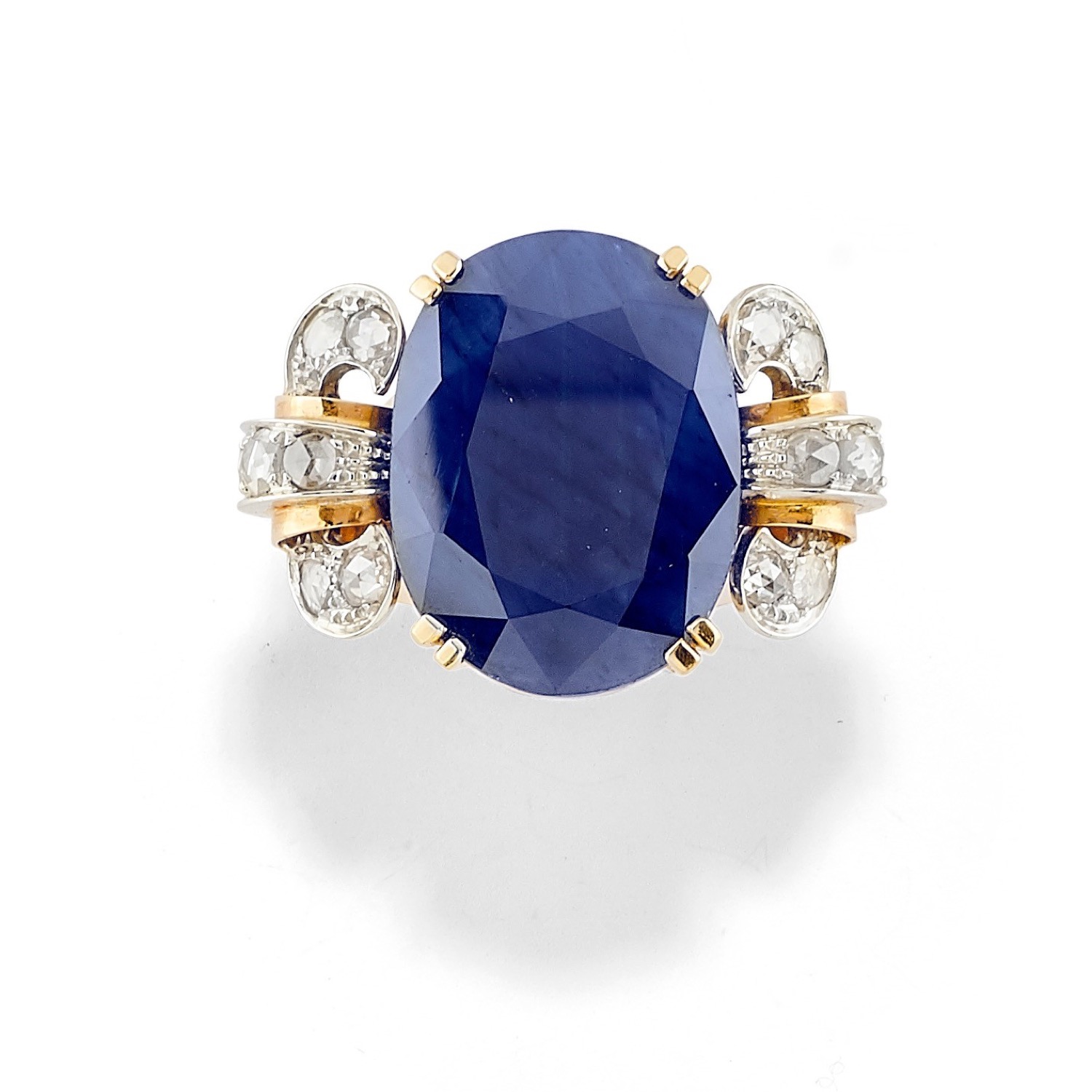 al centro zaffiro taglio ovale ct 50,00 ca, decorato ai lati da diamanti taglio rosa.