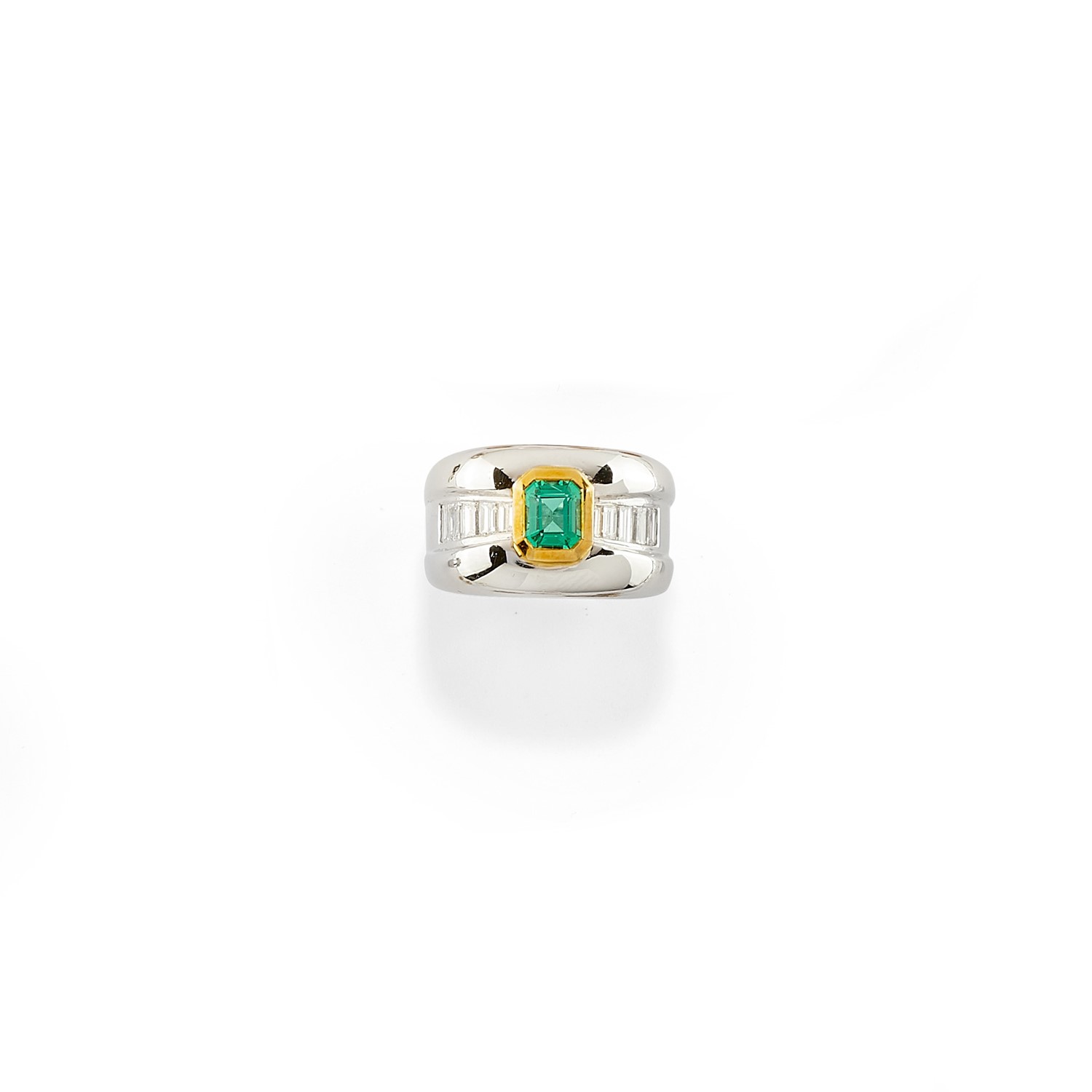 smeraldo taglio rettangolare a contorno ottagonale ct 0,70 ca e diamanti taglio baguette ct 1,00 ca.