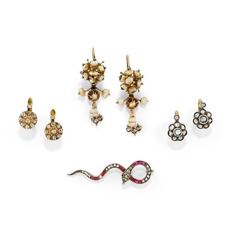 oro giallo 18K, oro bassa caratura, diamanti taglio rosa, microperle e pietre rosse, composto da tre coppie di orecchini e una spilla.