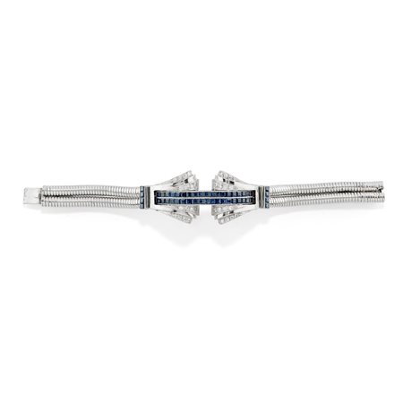 diamanti taglio brillante e zaffiri taglio carré, maglia realizzata a doppio filo in tubogas.