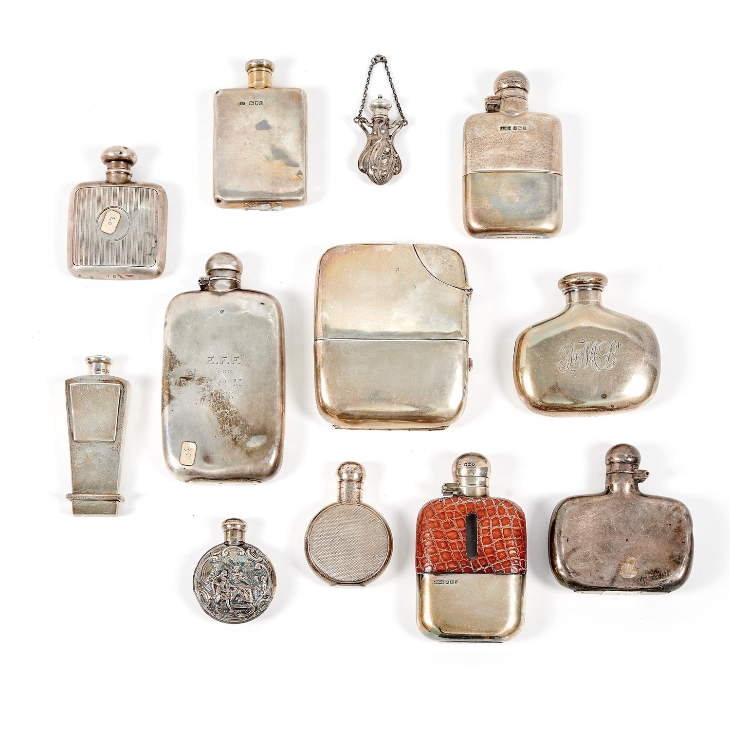 Lotto di argenti composto da dodici fiaschette e portaprofumi di varie forme e decori