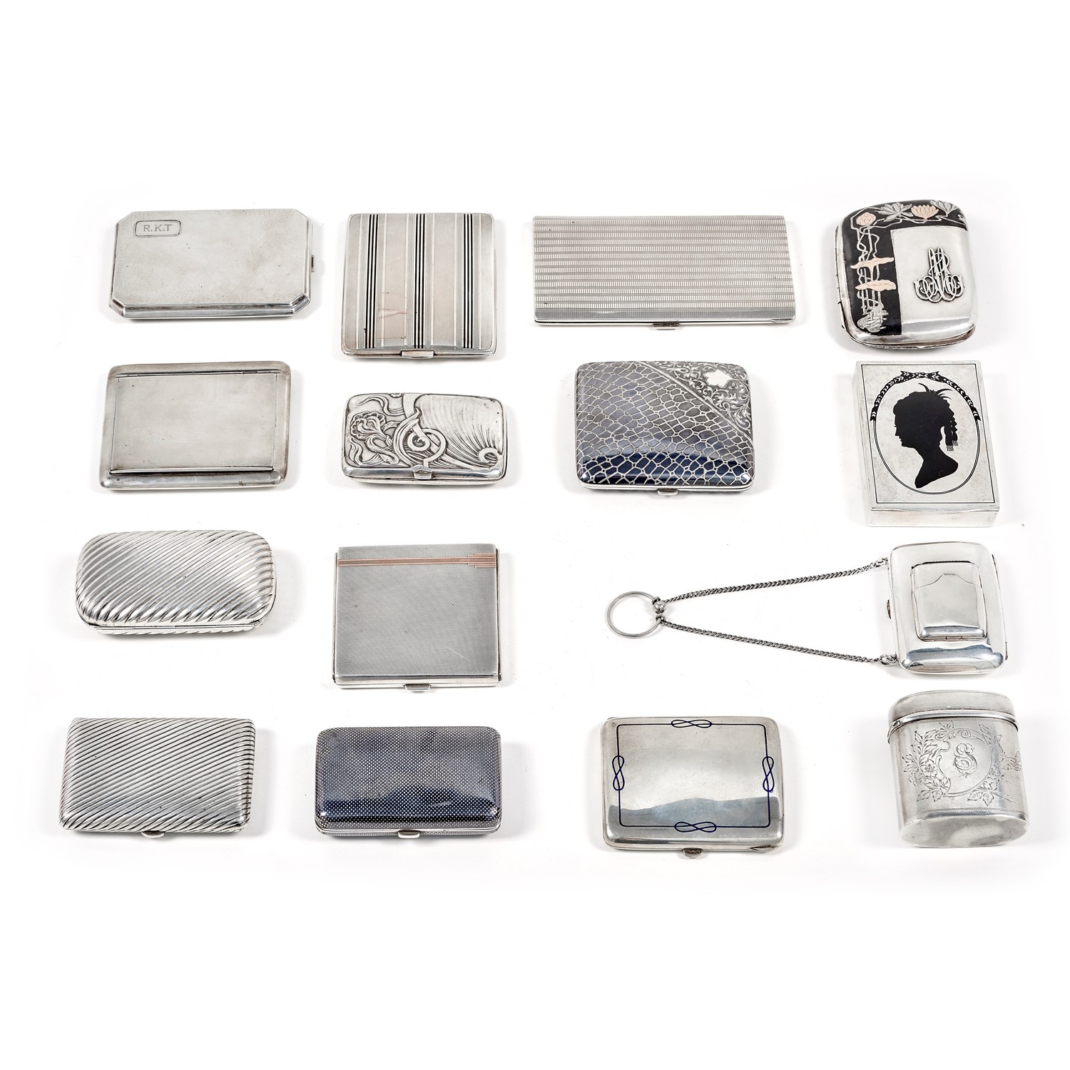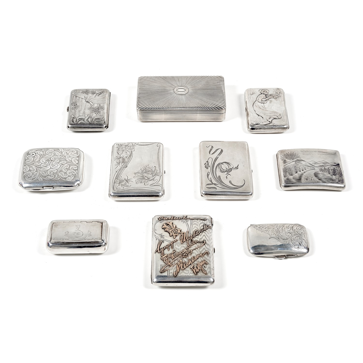 Lotto di argenti composto da ventiquattro porta sigarette e una tabacchiera