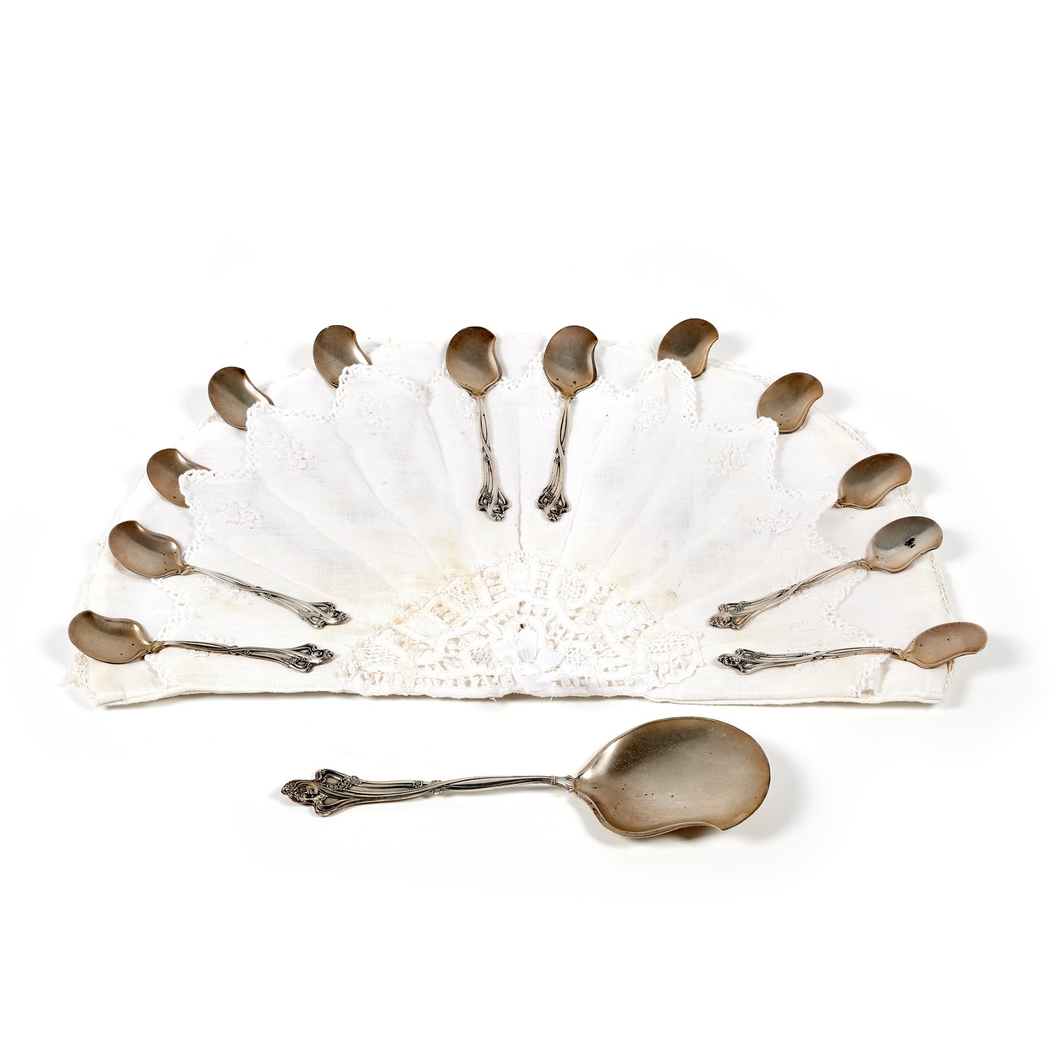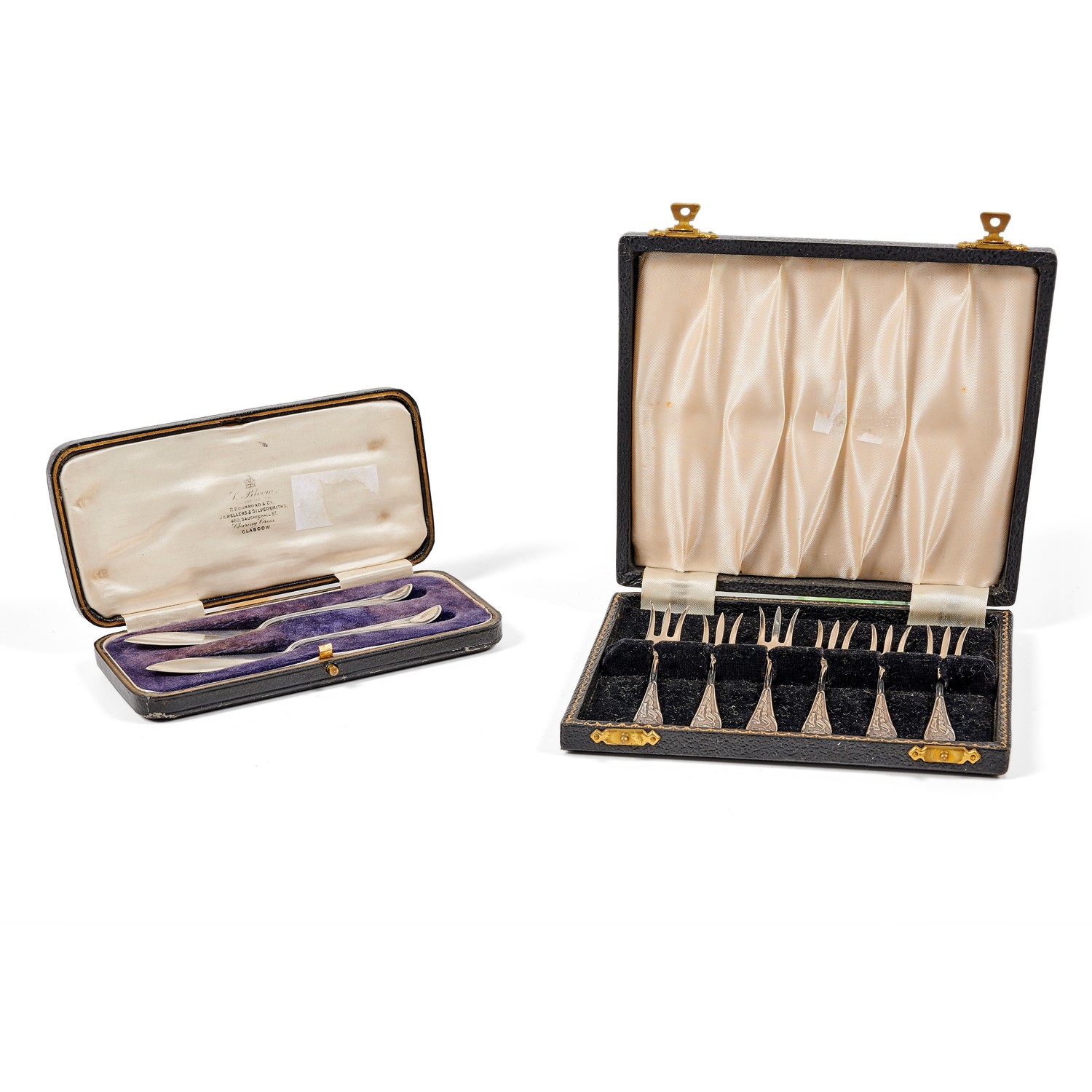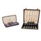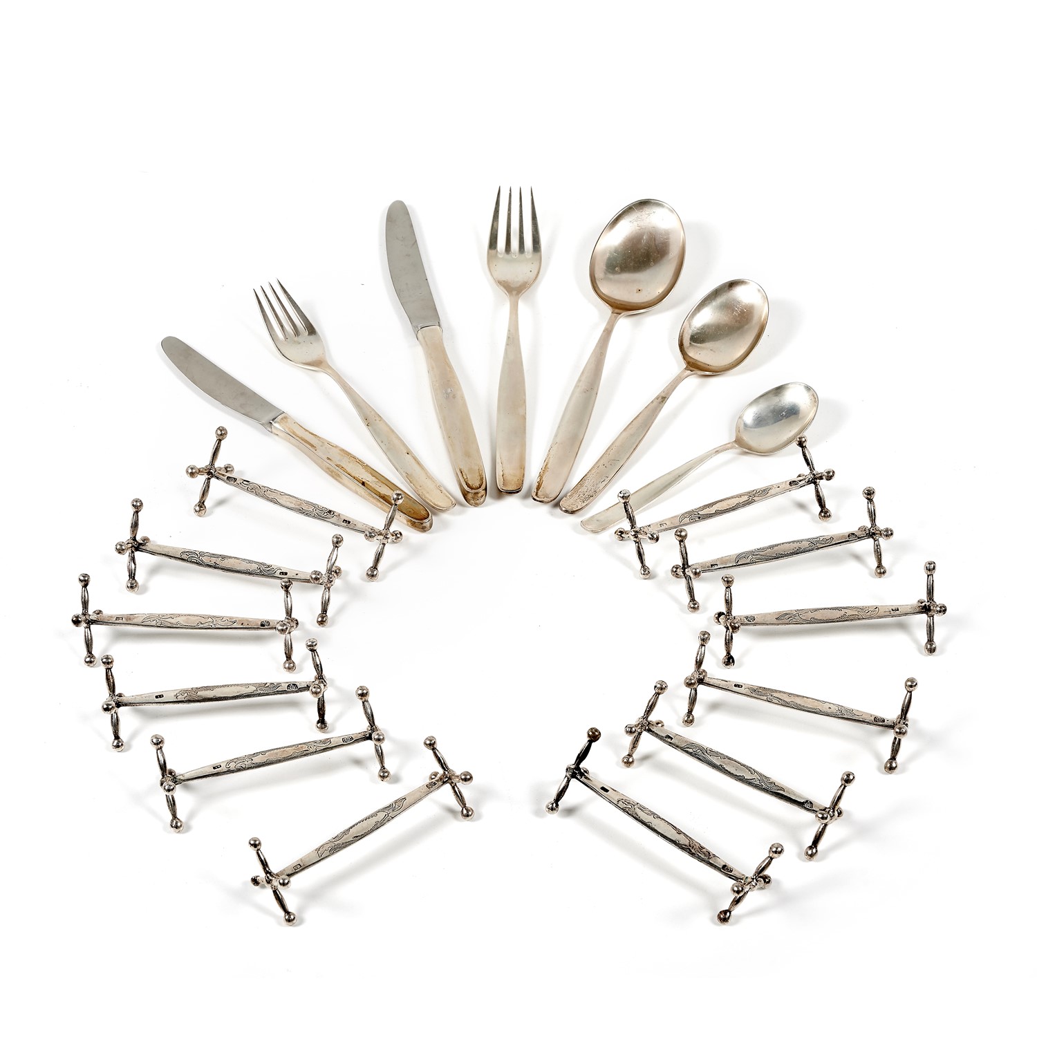 due coltellini, servizio di tredici cucchiai, dodici portaposate, sette posate miste, entro astucci.