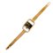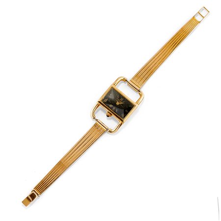 cassa rettangolare, quadrante nero con numeri romani in smalto chiaro, movimento a carica manuale, bracciale non originale.