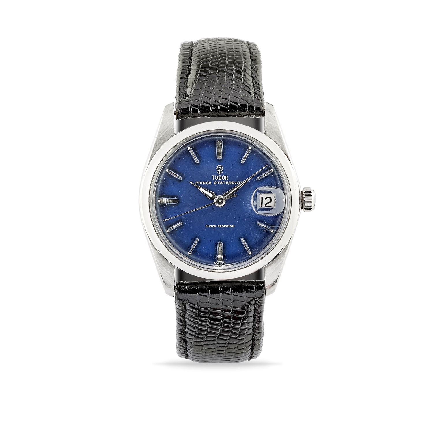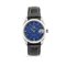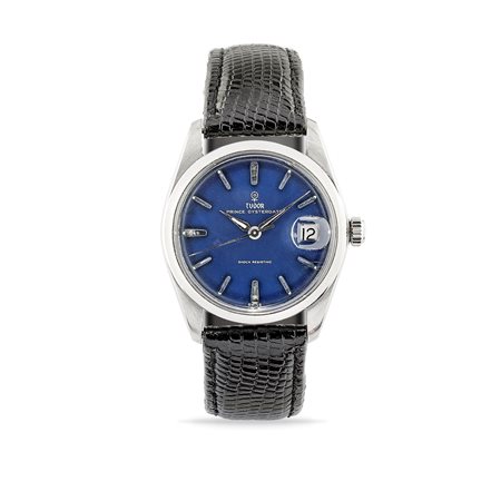 ref. 7962, in acciaio, rosellina, cassa rotonda, quadrante blu con indici applicati, secondi al centro, data al tre, movimento a carica manuale.