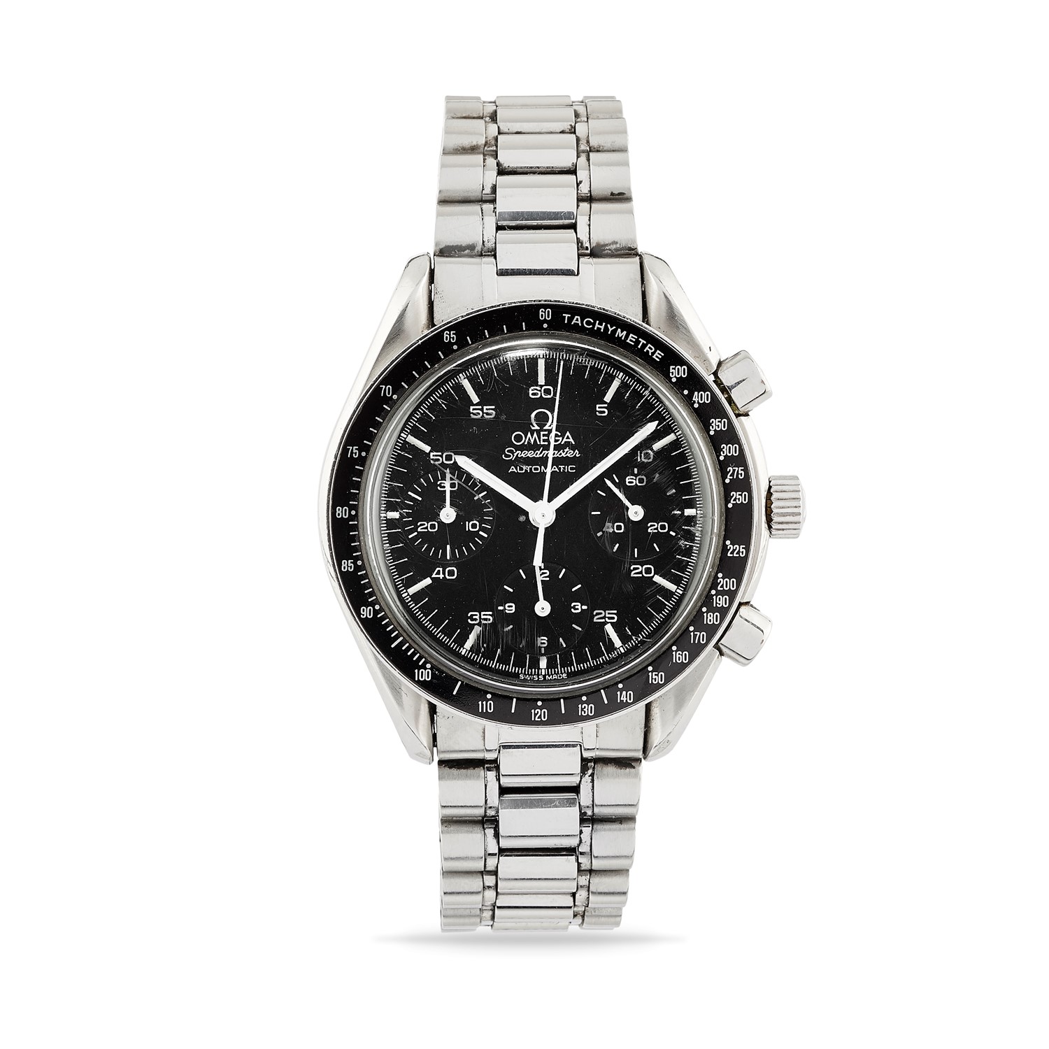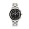 cronografo in acciaio, cassa rotonda, quadrante nero, indici smaltati, tre contatori, movimento a carica automatica.