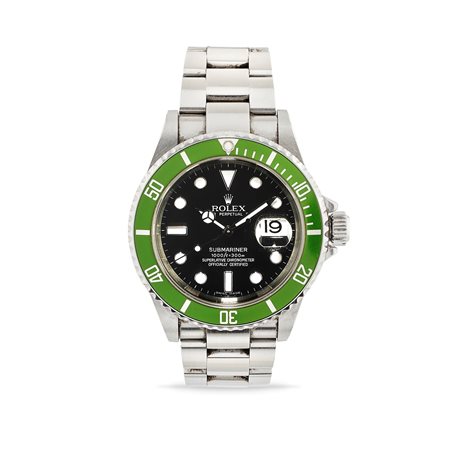 ref. 16610LV, seriale Z5xxxxx, in acciaio, ghiera verde, cassa rotonda, quadrante nero con indici applicati, data al tre, movimento a carica automatica, con astuccio.