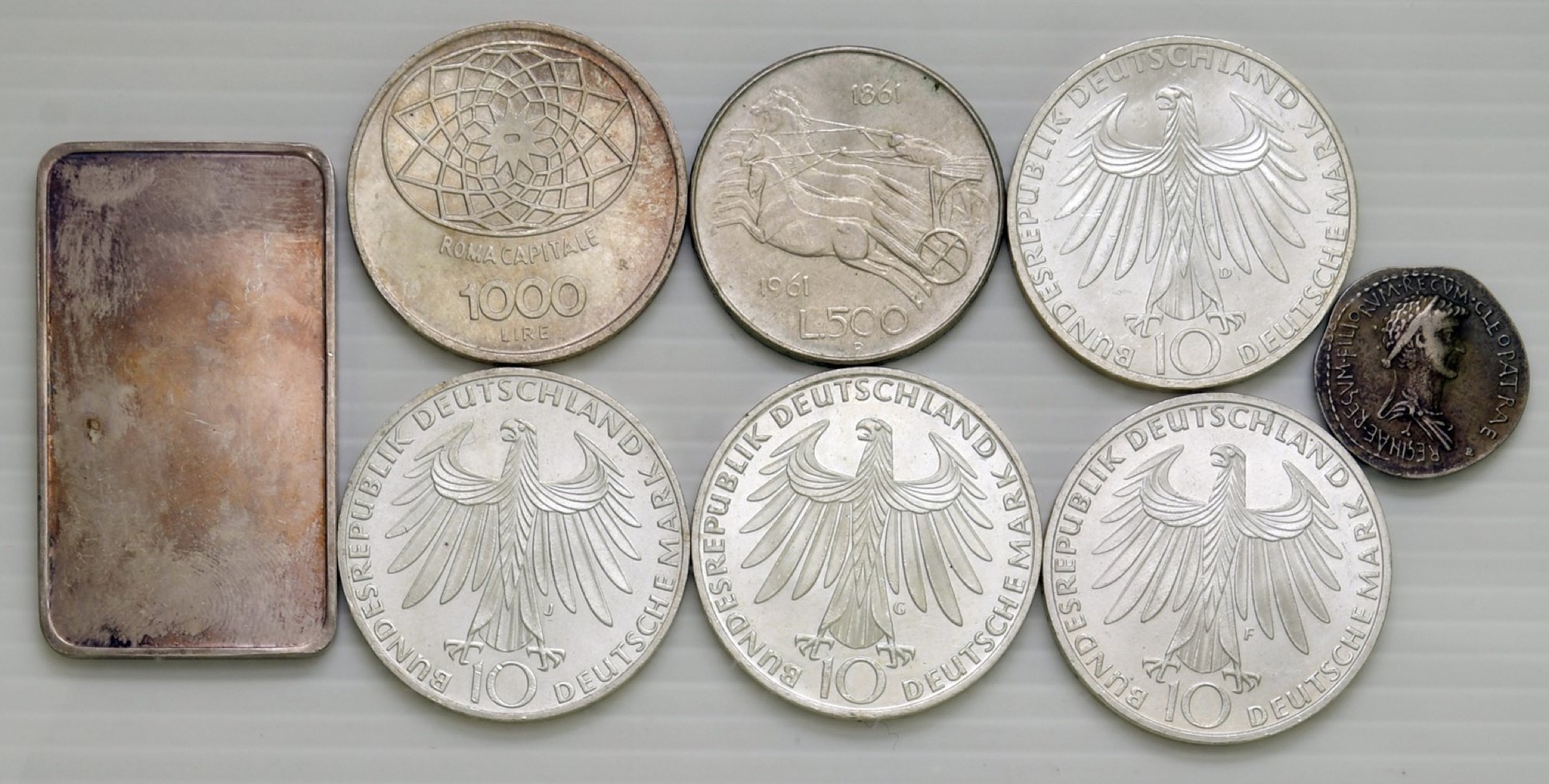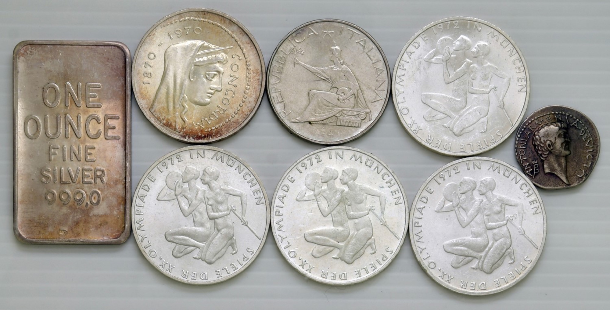 Precedente Lotto 685 Successivo Finarte - Via dei Bossi 2, 20121 Milano Jewelry Week ARGENTI - OROLOGI - MONETE / Sessione 3 mercoledì 24 giugno 2020 ore 14:30 (UTC +01:00) Varie Varie7 monete in argento (di cui un falso) e un lingotto in argento.