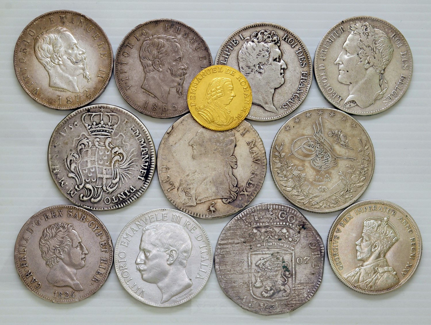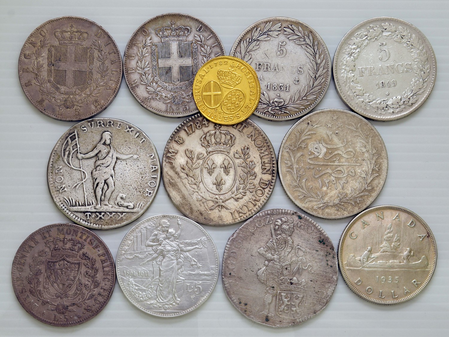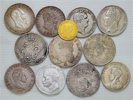 12 monete, di cui una in oro da 10 scudi 1782 di Malta ex montatura e undici in argento. Si segnalano: Carlo Felice, 5 lire 1824 Torino, Vittorio Emanuele II, 5 lire 1865 Napoli e Vittorio Emanuele III, 5 lire 1911 Cinquantenario. BB ma con traccia di app