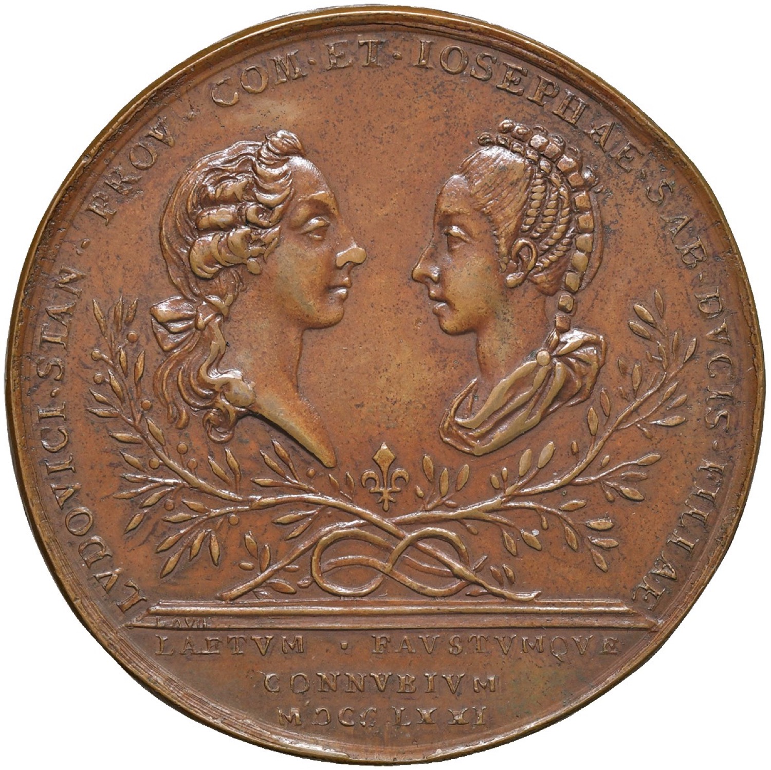 Medaglia 1771 per le nozze di Maria Giuseppina Luisa di Savoia con Luigi Stanislao Saverio di Francia, Conte di Provenza. Uds, 28 una in bronzo, mm. 49. BB/SPL