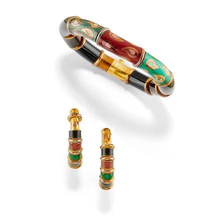 oro giallo 18K e smalto, composta da orecchini e bracciale.