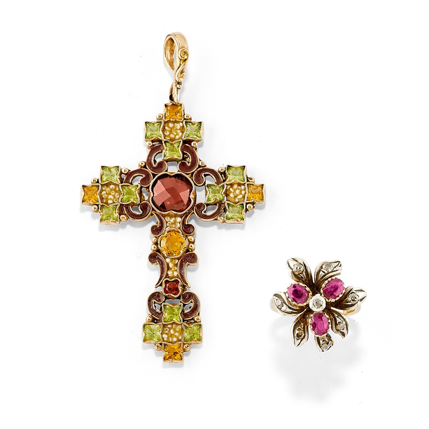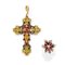 oro giallo 18K e 9K, microperle, rubini, diamanti e pietre colorate, composto da anello e pendente a croce.
