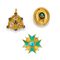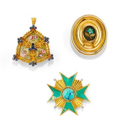 in oro 18K, micromosaico, turchese, zaffiri e smalto, di varie forme e raffigurazioni, difetti (lievi mancanze di smalto).