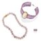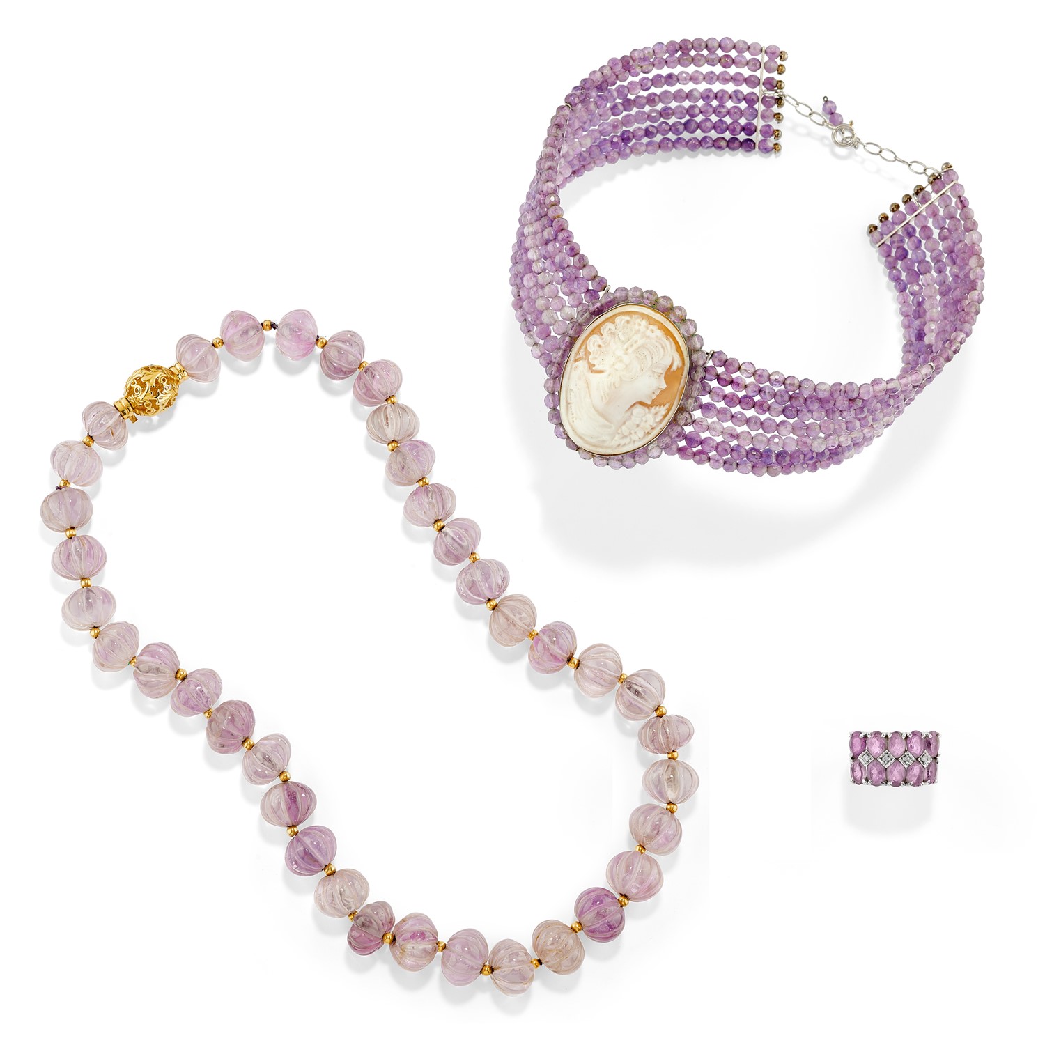 oro giallo 18K, metallo, pietre viola e diamanti, composto da due collane e un anello.