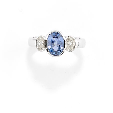 zaffiro taglio ovale ct 2,00 ca e ai lati due diamanti taglio ovale ct 1,00 ca.